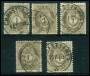 1877. 1 øre gråbrun type 1, 2, 4-6.