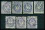 1877. 5 øre ultramarin ligg. vm. type 1, 3, 5, 7-8, 10, 11. NK. (24IIa)