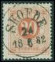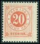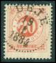 1877. 20 øre rød med 2-tal forbundet med cirkel.