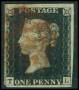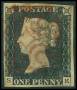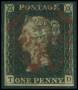 1840. 1 d. sort S-E, med rødt stp. og lille tyndhed.