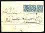 1876. 25 c. blå i 3-stribe på brudt korsbånd med indhold.