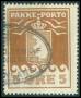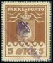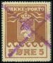 1915. 5 øre brun med hak i ø-rammen og afskårne hjørne nø og sø. AFA 950,-