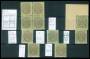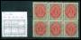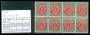 1889. 1 c. grøn/karmin tryk 7 i delt 9-blok med 8 postfriske. AFA 5100,-